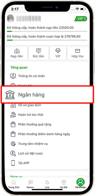 Bước 1Vào mục "Tài khoản" » Chọn "Ngân hàng".