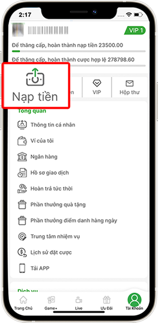 Bước 1Tại trang chủ vào mục "Tài khoản" » Chọn "Nạp tiền".