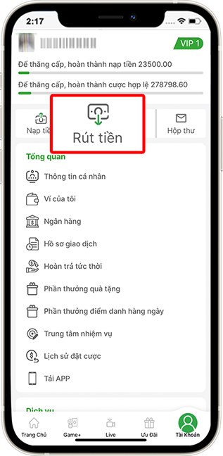 Tại trang chủ vào mục "Tài khoản" » Chọn "Rút tiền".
